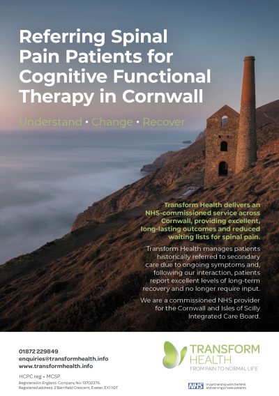 Transform Health provides a commissioned NHS service across Cornwall. We work with patients who have persistent or recurrent back and neck pain, with or without arm and leg pain. We measure treatment outcomes to ensure our approach is effective and are constantly reviewing our practice to maintain standards.